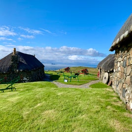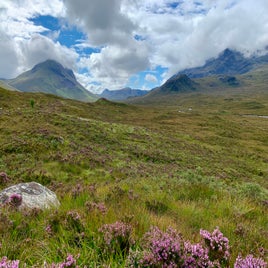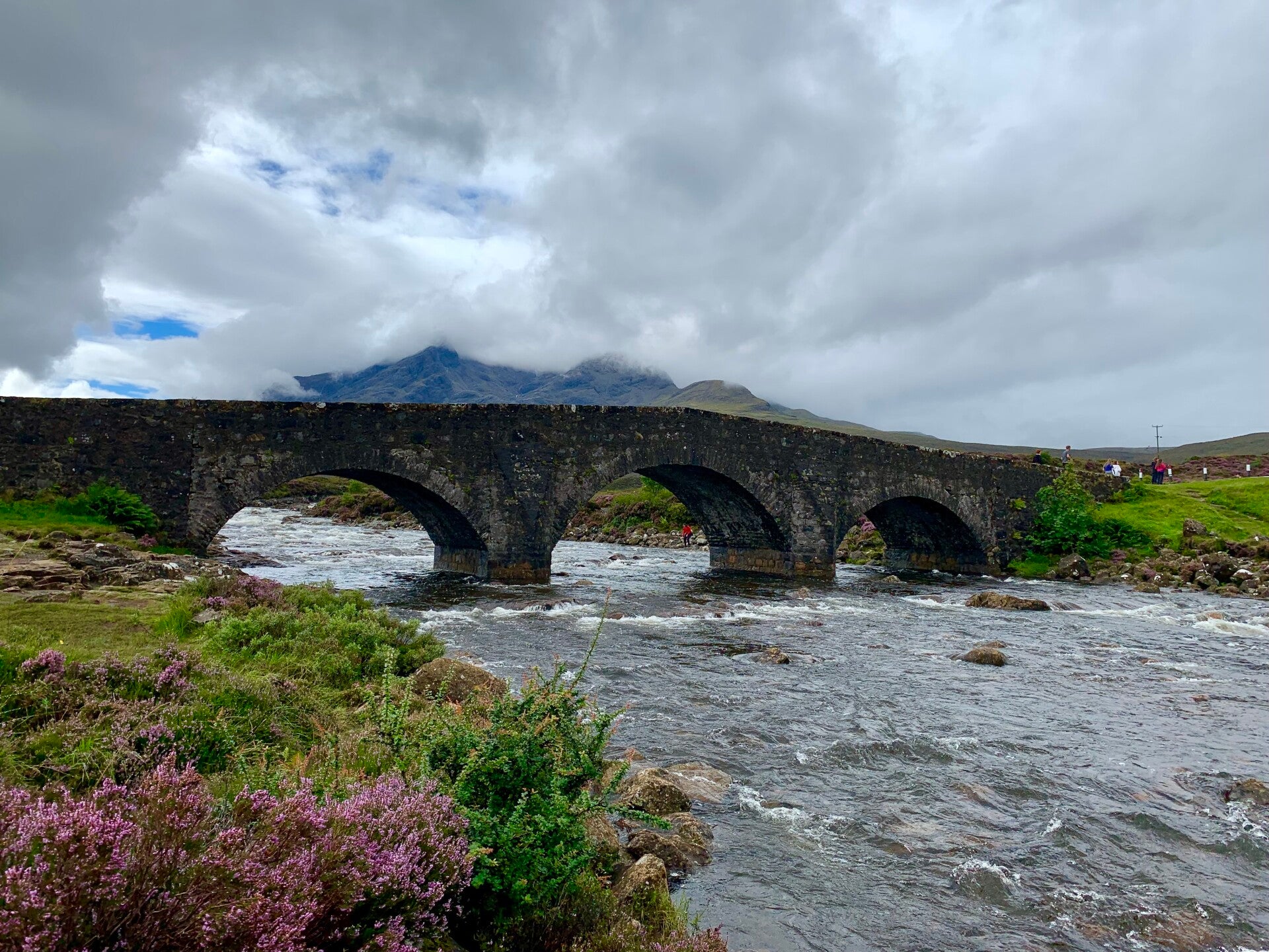 Kurzerhand haben wir hier auf dem Campingplatz um eine Nacht verlängert, damit ist die Übernachtung für heute Abend schon mal sicher. Nun starten wir unsere Sightseeingtour auf Skye nach Norden. Erster Stopp ist, wie kann es anders sein, eine alte Steinbrücke (Sligachan Old Bridge). Wir gehen noch ein Stück den John Muir Weg in Richtung Glen Sligachan und blicken zu den Cuillin Bergen. Bis uns die Midges (kleine nervige Beisfliegen) so auf den Geist gehen, dass wir wieder umdrehen und unsere Rundtour fortsetzen.