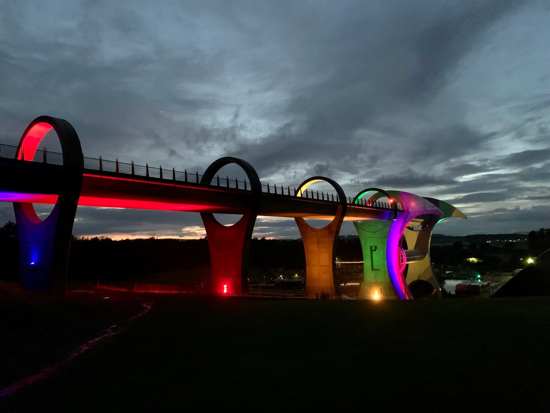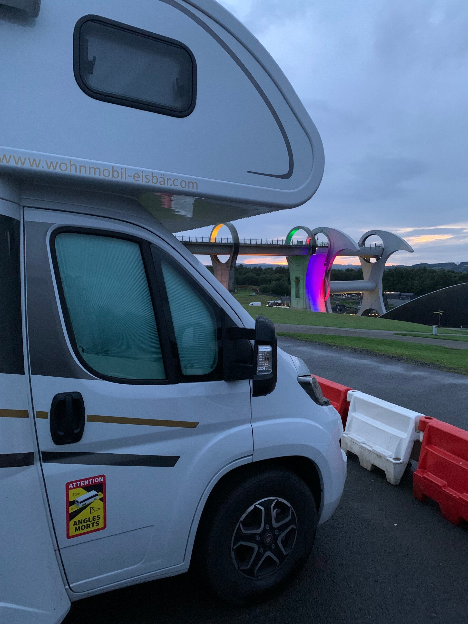 Nach der German Bratwurst mit Sauerkraut und Zwiebeln im labbrigen Brötchen sind wir in Richtung Westen aufgebrochen. Ziel ist Falkirk mit der Attraktion eines Schiffhebewerkes - das "Falkirk Wheel". Dies ist das weltweit erste und einzige rotierende Schiffshebewerk und verbindet zwei Kanäle und gleicht dabei 35m Höhenunterschied aus. Das Falkirk Wheel war ein Tipp von Matthias und als meines Vaters Sohn muss ich da natürlich hin. Die Anlage ist schon beeindruckend und oberhalb führt der Kanal noch durch einen farbig ausgeleuchteten Tunnel. Hier gibt es auch einen Stellplatz auf dem man übernachten und die Sanitäranlagen benutzen darf. So können wir zudem noch die nachts angestrahlte Anlage bewundern.
