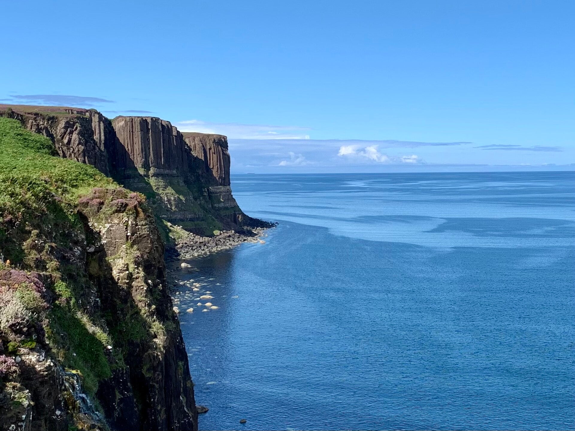 Eigentlich war der nächste Stopp bei Old Man of Storr geplant, einem 50 m hohem Basaltmonolithen. Aber hier war der Parkplatz bereits überfüllt und es blieb nur die Möglichkeit für ein Foto aus der Ferne. So sind wir weiter gedüst und haben dann planmäßig beim Kilt Rock gehalten. Die steil ins Meer abfallende Felskante ähnelt wohl einem Schottenrock und heißt deshalb Kilt Rock. Davor stürzt noch ein kleiner Wasserfall ins Meer. Das ganze kommt auf den Fotos wahrscheinlich nicht so beeindruckend rüber, wie es in Wirklichkeit ist.