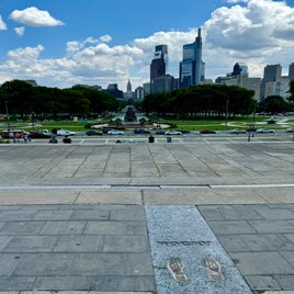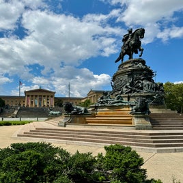 Nun aber los und die Stadt erkunden. Vom Bahnhof geht's zuerst entlang des Schuylkill River bis zum Philadelphia Museum of Art (Kunstmuseum). Dieser Park am Fluss entlang wird viel von Joggern, Radfahrern und Hundebesitzern genutzt. Beim Kunstmuseum angekommen, erklimmen wir natürlich die Rocky-Steps, machen Fotos und so ziemlich als einzige umrunden wir das Museum und werden mit Aussichten auf den Fluss belohnt. Vor den Treppen entdecken wir noch die Rocky-Statue und gegenüber das Washington Monument Fontain.